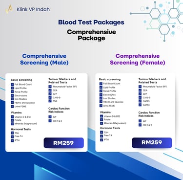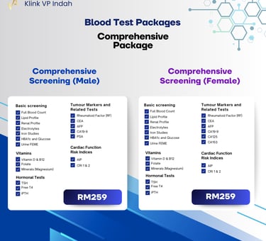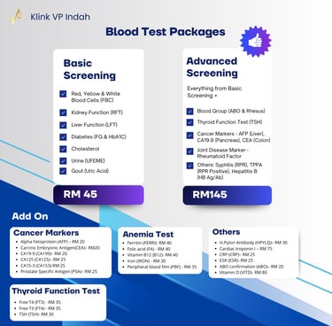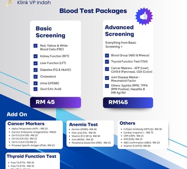 We offer 3 packages (Basic, Advanced and Comprehensive). Each package offering a detailed analysis of vital health markers, including cholesterol, blood sugar, liver, kidney, and urine, helping detect potential health issues early for proactive care.